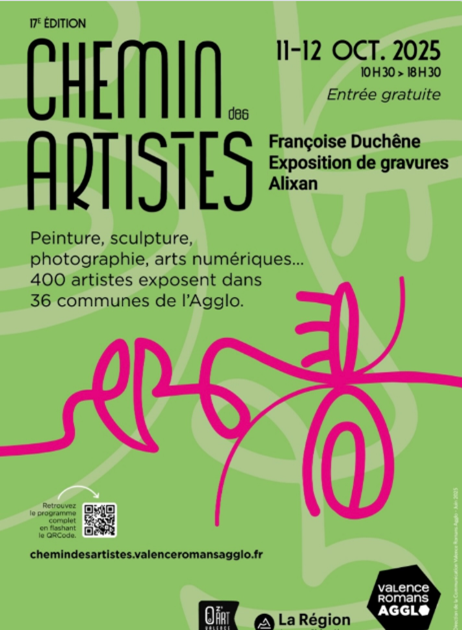 Françoise Duchêne expose le week-end prochain à Alixan dans le cadre de Chemin d’artistes. Le vernissage aura lieu le samedi 11 octobre à 19h. Il sera animé par le groupe de jeunes danseurs de l’école de Malissard, M’Danse et de leur professeur Carole.